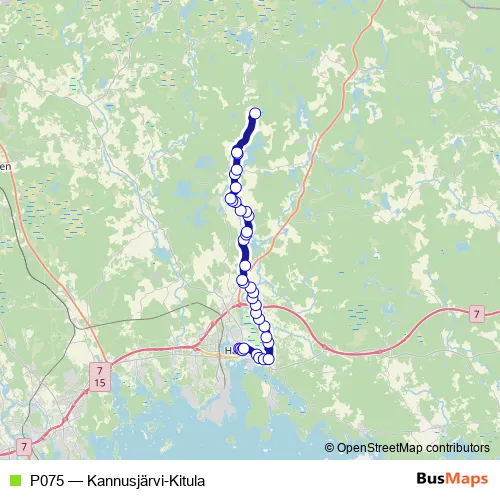 The first stop of the P075 bus route is Hamina linja-autoasema and the last stop is Kitulantie 149 E. P075 (Kannusjärvi-Kitula) is operational during everyday.