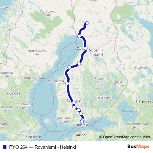 The first stop of the PYO 264 rail route is Rovaniemi and the last stop is Helsinki. PYO 264 (Rovaniemi - Helsinki) is operational during everyday.
