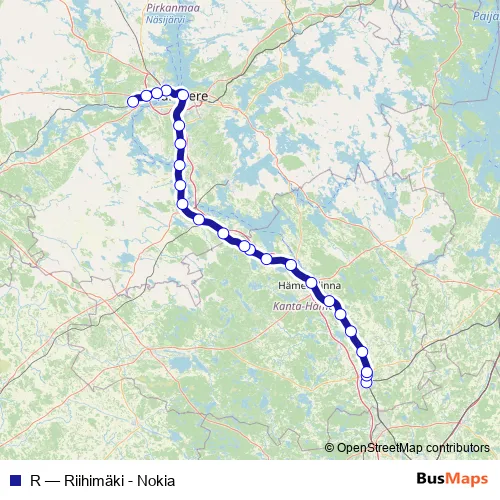 The first stop of the R rail route is Nokia and the last stop is Riihimäki. R (Riihimäki - Nokia) is operational during on weekdays.