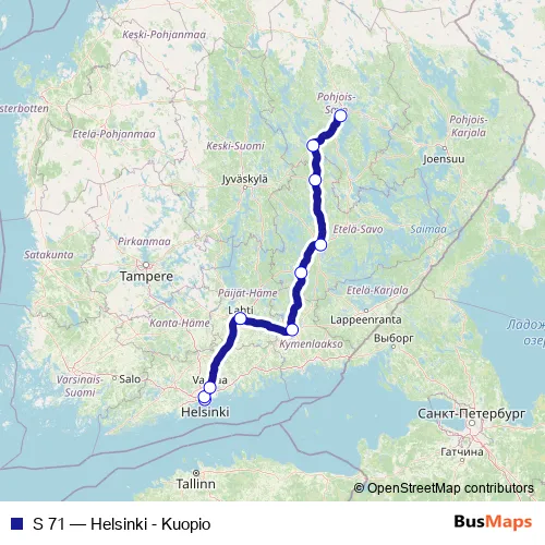 The first stop of the S 71 rail route is Helsinki and the last stop is Kuopio. S 71 (Helsinki - Kuopio) is operational during everyday.