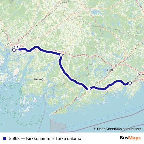 The first stop of the S 963 rail route is Kirkkonummi and the last stop is Turku satama. S 963 (Kirkkonummi - Turku satama) is operational during everyday.