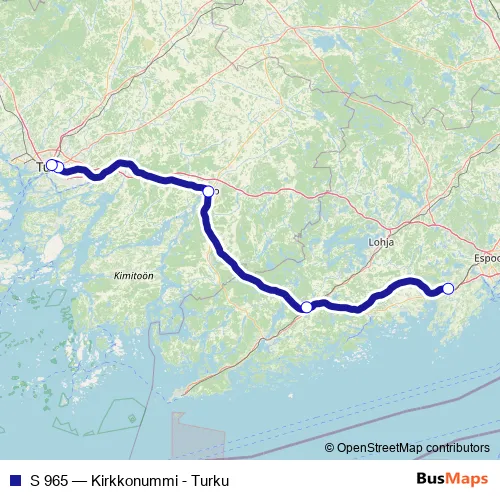 The first stop of the S 965 rail route is Kirkkonummi and the last stop is Turku. S 965 (Kirkkonummi - Turku) is operational during everyday.