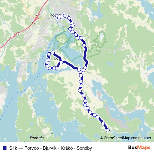 The first stop of the S1k bus route is 6 and the last stop is Sondby. S1k (Porvoo - Bjurvik - Kråkö - Sondby) is operational during on weekdays.