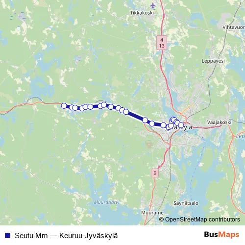The first stop of the Seutu Mm bus route is Vehkasuontie I and the last stop is Jyväskylä Matkakeskus 3. Seutu Mm (Keuruu-Jyväskylä) is operational during on weekdays.