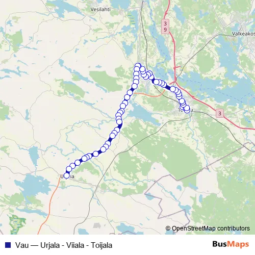 The first stop of the Vau bus route is Akaa rautatieasema (Toijala) and the last stop is Urjala. Vau (Urjala - Viiala - Toijala) is operational during on weekdays.