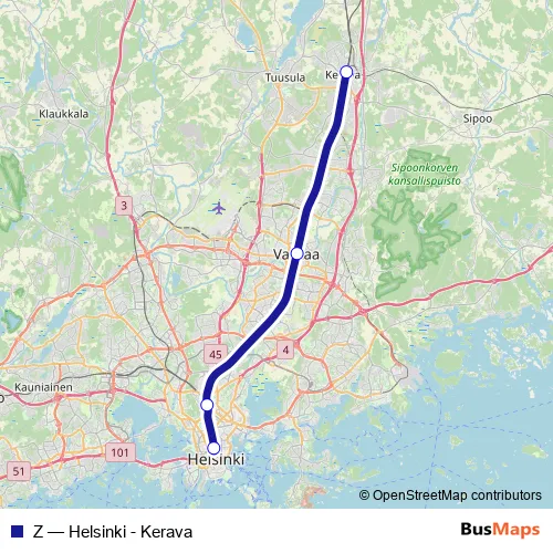 See why over 2 million users trust and consider busmaps.com as the best public transport website. busmaps gives you Helsinki Rail Services suggested routes, real-time bus tracker, line route maps in Helsinki, and helps to find the closest Z rail stops near you. No internet available? Download an offline PDF map and bus schedule for the Z rail to take on your trip.
