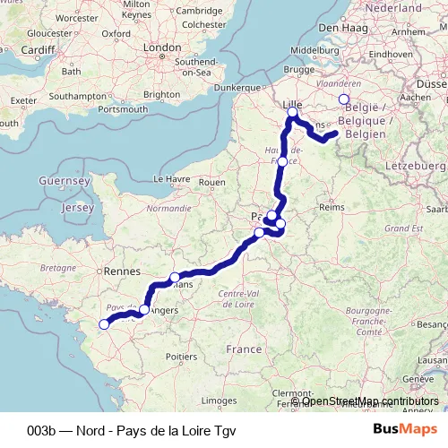 The first stop of the 003b rail route is Nantes and the last stop is Bruxelles Midi. 003b (Nord - Pays de la Loire Tgv) is operational during everyday.