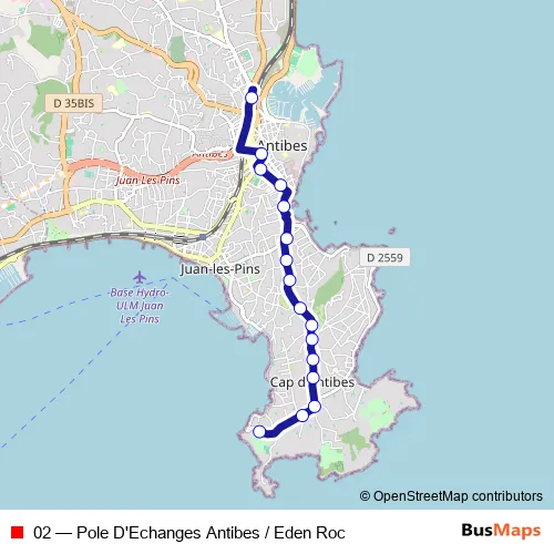 The first stop of the 02 bus route is Eden Roc and the last stop is Pole D'Echanges Antibes. 02 (Pole D'Echanges Antibes / Eden Roc) is operational during everyday.