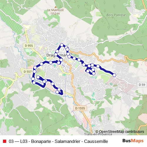 See why over 2 million users trust and consider busmaps.com as the best public transport website. busmaps gives you Draguignan Buses suggested routes, real-time bus tracker, line route maps in Draguignan, and helps to find the closest 03 bus stops near you. No internet available? Download an offline PDF map and bus schedule for the 03 bus to take on your trip.