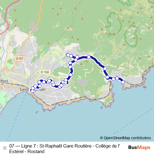 The first stop of the 07 bus route is Saint-Raphaël Gare Routière (Quai F) and the last stop is Rostand (Côté Abribus). 07 (Ligne 7 : St-Raphaël Gare Routière - Collège de l'Estérel - Rostand) is operational during everyday.