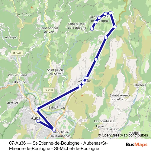 The first stop of the 07-Au36 bus route is Place de la Paix and the last stop is Les Gouzis. 07-Au36 (St-Etienne-de-Boulogne - Aubenas/St-Etienne-de-Boulogne - St-Michel-de-Boulogne) is operational during on weekdays.