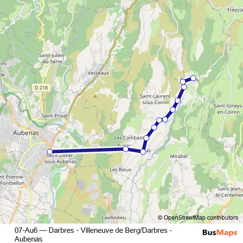 The first stop of the 07-Au6 bus route is Gare Routière and the last stop is Cimetière. 07-Au6 (Darbres - Villeneuve de Berg/Darbres - Aubenas) is operational during on weekdays.