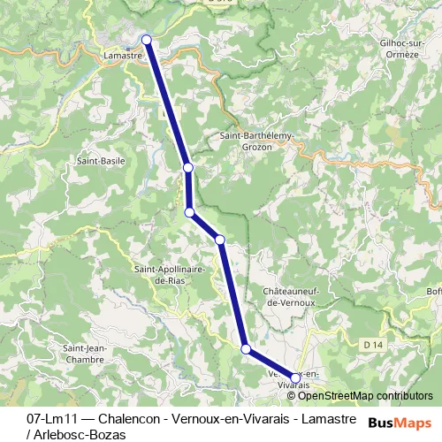 The first stop of the 07-Lm11 bus route is Collège Vivarais and the last stop is Place P. Delarbre. 07-Lm11 (Chalencon - Vernoux-en-Vivarais - Lamastre / Arlebosc-Bozas) is operational during on weekdays.