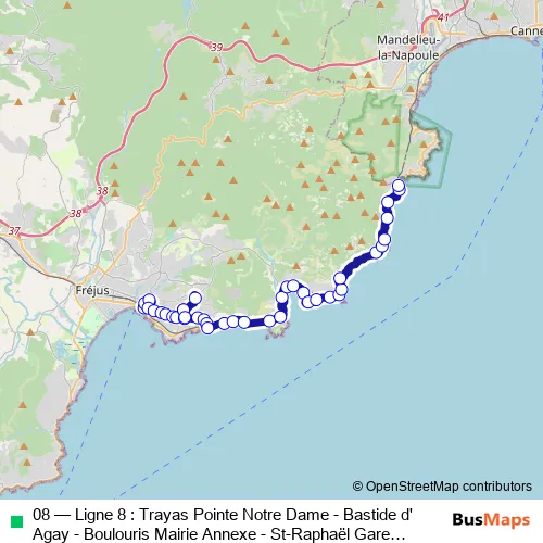 The first stop of the 08 bus route is Saint-Raphaël Gare Routière (Quai H) and the last stop is Trayas Pointe Notre Dame. 08 (Ligne 8 : Trayas Pointe Notre Dame - Bastide d'Agay - Boulouris Mairie Annexe - St-Raphaël Gare Routière) is operational during on weekdays.