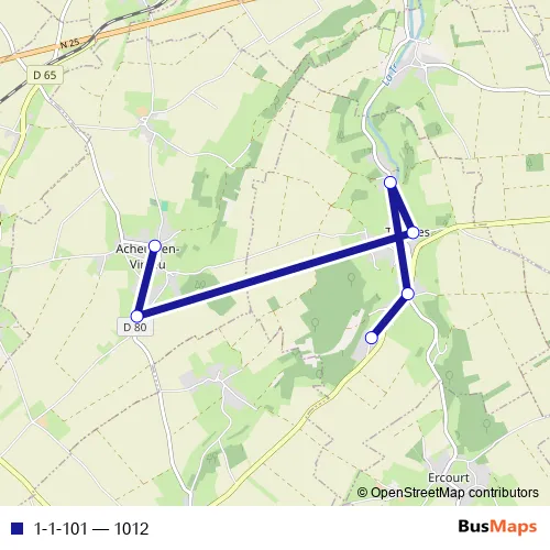 The first stop of the 1-1-101 bus route is Toeufles - Haut Rogeant and the last stop is Acheux-EN-Vimeu - Ecole. 1-1-101 (1012) is operational during everyday.