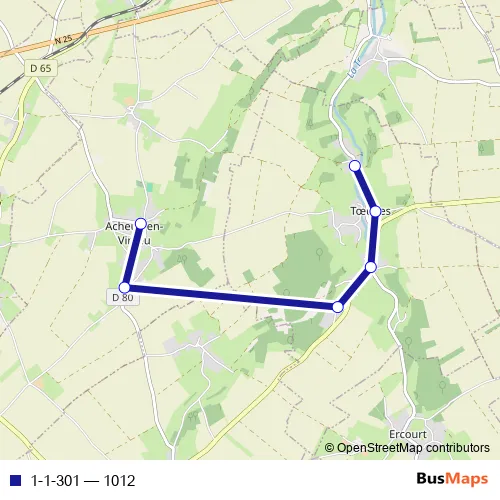 The first stop of the 1-1-301 bus route is Acheux-EN-Vimeu - Ecole and the last stop is Toeufles - Le Chaussoy. 1-1-301 (1012) is operational during everyday.