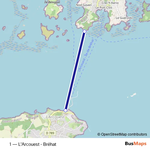 The first stop of the 1 ferry route is Embarcadère Pointe de l'Arcouest and the last stop is Embarcadère Île de Bréhat. 1 (L'Arcouest - Bréhat) is operational during everyday.
