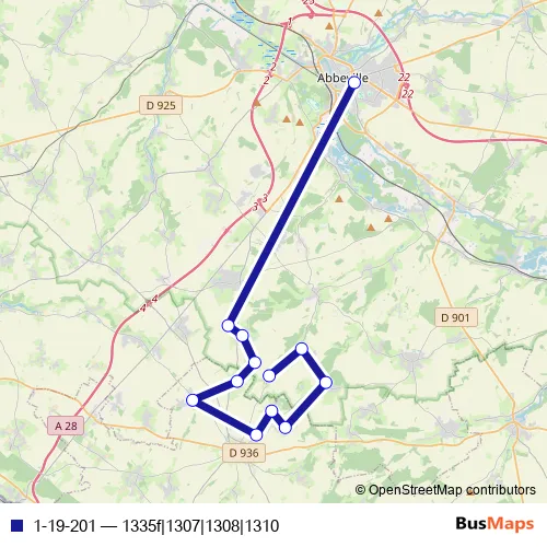 The first stop of the 1-19-201 bus route is Abbeville - Cité scolaire and the last stop is Vaux-Marquenneville - Abri rue principale. 1-19-201 (1335f|1307|1308|1310) is operational during everyday.