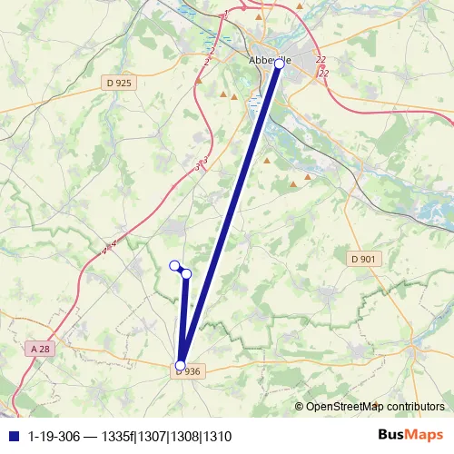 The first stop of the 1-19-306 bus route is Abbeville - Cité scolaire and the last stop is Doudelainville - Warcheville - Rue du 8 mai 1945. 1-19-306 (1335f|1307|1308|1310) is operational during everyday.