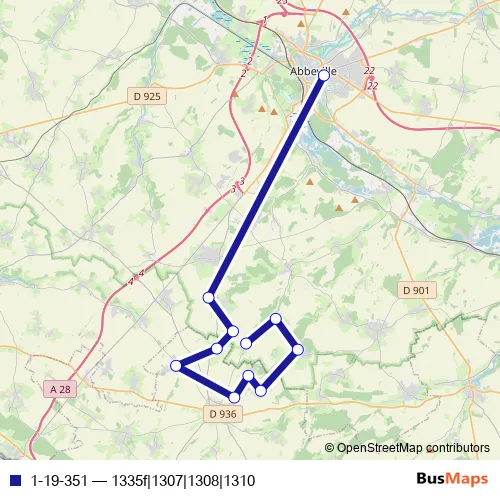 The first stop of the 1-19-351 bus route is Abbeville - Cité scolaire and the last stop is Vaux-Marquenneville - Abri rue principale. 1-19-351 (1335f|1307|1308|1310) is operational during everyday.