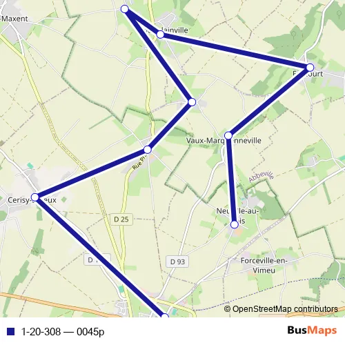 The first stop of the 1-20-308 bus route is Oisemont - Collège Charles Bignon and the last stop is Neuville-AU-Bois - Centre. 1-20-308 (0045p) is operational during everyday.
