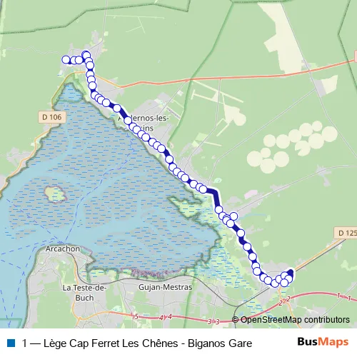 The first stop of the 1 bus route is Les Chênes and the last stop is Portes du Delta. 1 (Lège Cap Ferret Les Chênes - Biganos Gare) is operational during everyday.