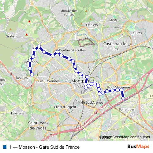 See why over 2 million users trust and consider busmaps.com as the best public transport website. busmaps gives you Montpellier Trams suggested routes, real-time bus tracker, line route maps in Montpellier, and helps to find the closest 1 tram stops near you. No internet available? Download an offline PDF map and bus schedule for the 1 tram to take on your trip.