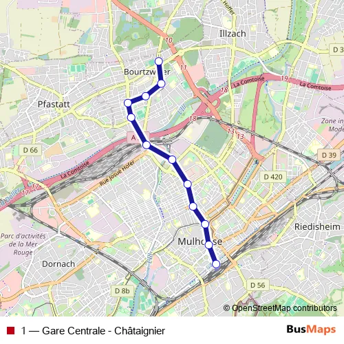 See why over 2 million users trust and consider busmaps.com as the best public transport website. busmaps gives you Mulhouse Trams suggested routes, real-time bus tracker, line route maps in Mulhouse, and helps to find the closest 1 tram stops near you. No internet available? Download an offline PDF map and bus schedule for the 1 tram to take on your trip.