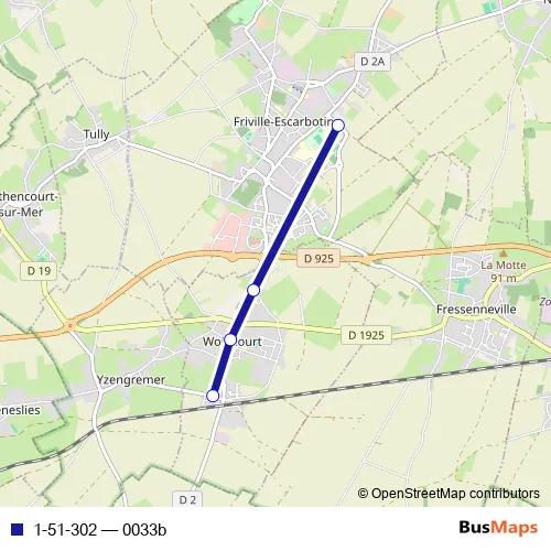 The first stop of the 1-51-302 bus route is Friville-Escarbotin - Collège La Rose des Vents and the last stop is Woincourt - Gare - Rue Henri Martel. 1-51-302 (0033b) is operational during everyday.