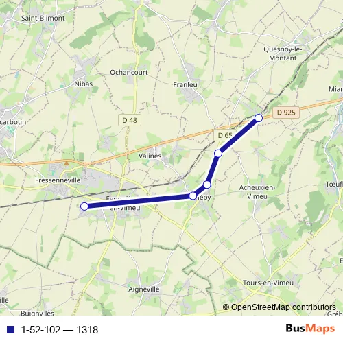 The first stop of the 1-52-102 bus route is Acheux-EN-Vimeu - Frireulles and the last stop is Feuquieres-EN-Vimeu - Collège Segpa Gaston Vasseur. 1-52-102 (1318) is operational during on weekdays.