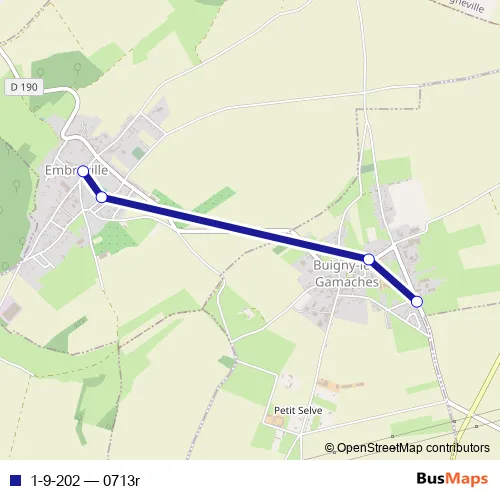 The first stop of the 1-9-202 bus route is Buigny-LES-Gamaches - Abri route de Gamaches and the last stop is Embreville - Ecole. 1-9-202 (0713r) is operational during everyday.