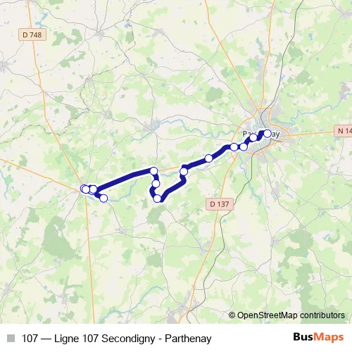 The first stop of the 107 bus route is Secondigny - Place Mairie Abribus and the last stop is Parthenay - Gare Routiere. 107 (Ligne 107 Secondigny - Parthenay) is operational during on weekdays.