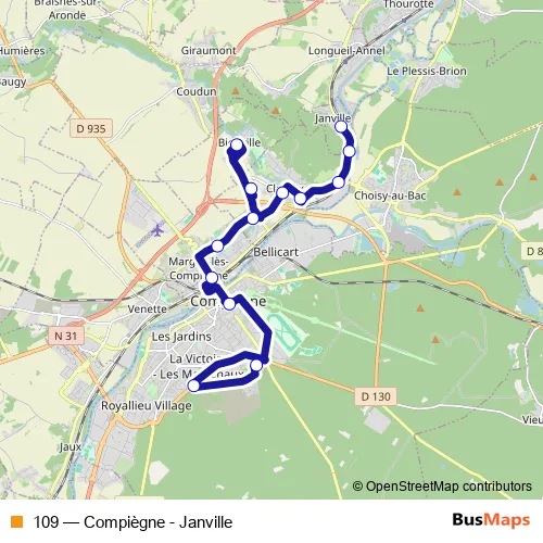 The first stop of the 109 bus route is Les Lycées and the last stop is Janville. 109 (Compiègne - Janville) is operational during everyday.
