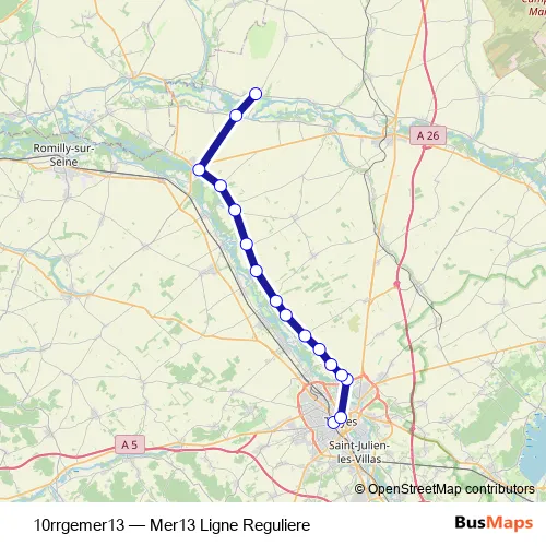 The first stop of the 10rrgemer13 bus route is Troyes - Gare Sncf and the last stop is Plancy-L'Abbaye - Mairie. 10rrgemer13 (Mer13 Ligne Reguliere) is operational during everyday.