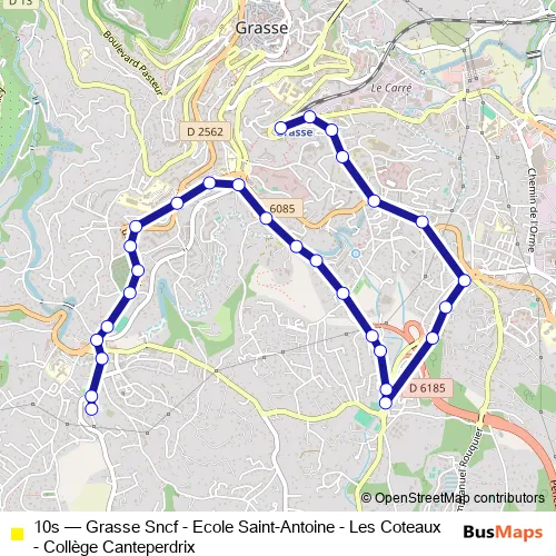 The first stop of the 10s bus route is College Canteperdrix and the last stop is Grasse Sncf. 10s (Grasse Sncf - Ecole Saint-Antoine - Les Coteaux - Collège Canteperdrix) is operational during on weekdays.