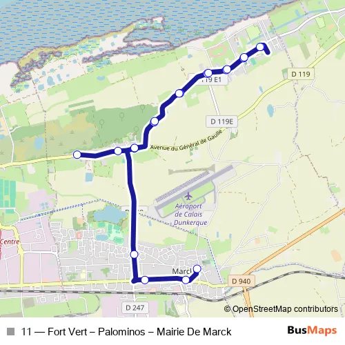 Click here to view the nearest 11 - Fort Vert – Palominos – Mairie De Marck bus stop.