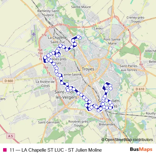 See why over 2 million users trust and consider busmaps.com as the best public transport website. busmaps gives you Troyes Buses suggested routes, real-time bus tracker, line route maps in Troyes, and helps to find the closest 11 bus stops near you. No internet available? Download an offline PDF map and bus schedule for the 11 bus to take on your trip.