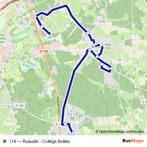 The first stop of the 114 bus route is Collège Bollée and the last stop is Les Landes. 114 (Ruaudin - Collège Bollée) is operational during on weekdays.