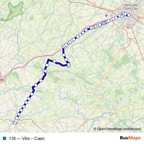 The first stop of the 116 bus route is Vire - Champ de Foire and the last stop is Gare Routière. 116 (Vire – Caen) is operational during everyday.