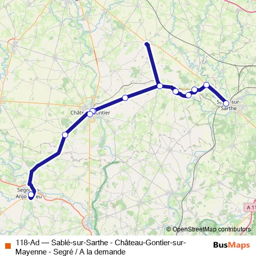 Services on the 118-Ad - Sablé-sur-Sarthe - Château-Gontier-sur-Mayenne - Segré / A la demande bus start at 10:30 on Monday, Tuesday, Wednesday, Thursday, Friday, Saturday, Sunday.