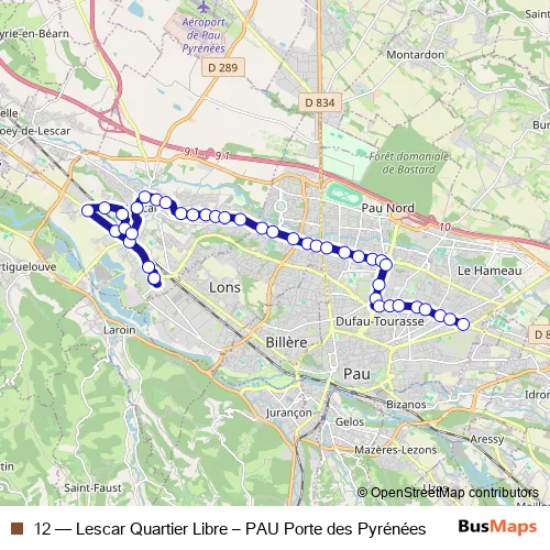 The first stop of the 12 bus route is Lescar Quartier Libre and the last stop is PAU Porte des Pyrénées Quai B. 12 (Lescar Quartier Libre – PAU Porte des Pyrénées) is operational during everyday.