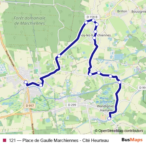 The first stop of the 121 bus route is Place de Gaulle - Marchiennes and the last stop is La Navie. 121 (Place de Gaulle Marchiennes - Cité Heurteau) is operational during everyday.