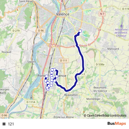 See why over 2 million users trust and consider busmaps.com as the best public transport website. busmaps gives you Valence Buses suggested routes, real-time bus tracker, line route maps in Valence, and helps to find the closest 121 bus stops near you. No internet available? Download an offline PDF map and bus schedule for the 121 bus to take on your trip.