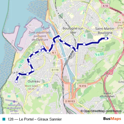 The first stop of the 128 bus route is Giraux Sannier and the last stop is Alprech. 128 (Le Portel – Giraux Sannier) is operational during on weekdays.