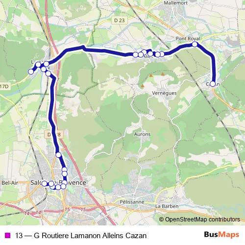 See why over 2 million users trust and consider busmaps.com as the best public transport website. busmaps gives you Salon-de-Provence Buses suggested routes, real-time bus tracker, line route maps in Salon-de-Provence, and helps to find the closest 13 bus stops near you. No internet available? Download an offline PDF map and bus schedule for the 13 bus to take on your trip.