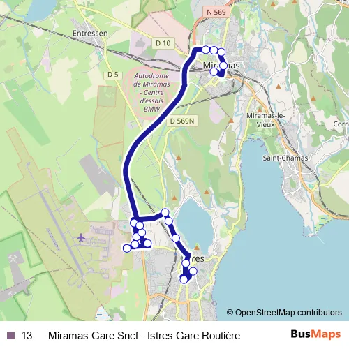 The first stop of the 13 bus route is Gare Istres and the last stop is Sncf Miramas. 13 (Miramas Gare Sncf - Istres Gare Routière) is operational during everyday.