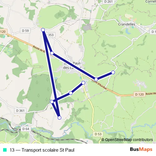 Services on the 13 - Transport scolaire St Paul bus stop at 13:00 on Monday, Tuesday, Wednesday, Thursday, Friday.