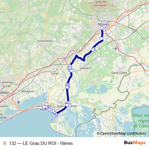The first stop of the 132 bus route is Nîmes - Gare Routière and the last stop is LA Grande-Motte - La Poste. 132 (LE Grau DU ROI - Nimes) is operational during everyday.
