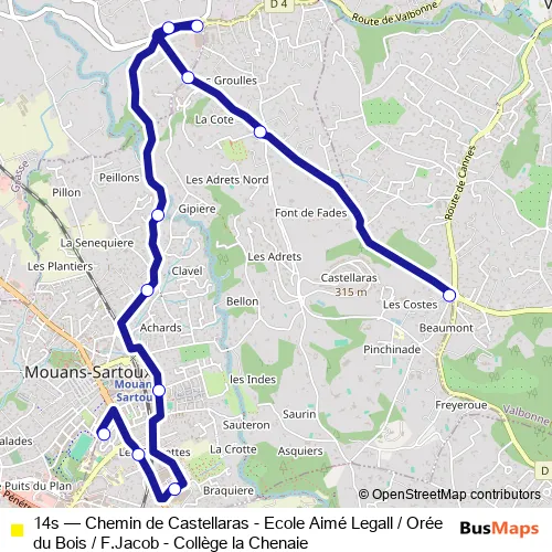 See why over 2 million users trust and consider busmaps.com as the best public transport website. busmaps gives you Mouans-Sartoux Buses suggested routes, real-time bus tracker, line route maps in Mouans-Sartoux, and helps to find the closest 14s bus stops near you. No internet available? Download an offline PDF map and bus schedule for the 14s bus to take on your trip.