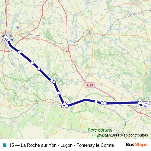 The first stop of the 15 bus route is Avenue Marceau and the last stop is PEM-Sncf. 15 (La Roche sur Yon - Luçon - Fontenay le Comte) is operational during everyday.